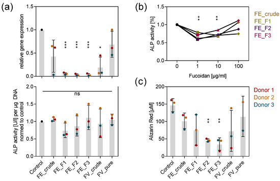 To better understand how fucoidans affect angio- and osteogenic processes on a molecular level in a bone tissue setting and what influence chemical properties have, we treated mono- and co-cultures of primary endothelial and osteoblast-like cells with four chemically well-characterized fucoidan extracts and quantified expression and protein levels of the important angiogenic regulators VEGF, SDF-1, ANG-1 and ANG-2. Additionally, we quantified alkaline phosphatase (ALP) activity and calcification level as early and late osteogenic differentiation markers, respectively. Therefore, we isolated human outgrowth endothelial cells (OEC) from blood [19] and mesenchymal stem cells from bone tissue [20] and differentiated the mesenchymal stem cells to an osteoblast-like lineage (MSC). We extracted crude fucoidan (FE_crude) from Fucus distichus subsp. evanescens (FE) with a green and reproducible enzyme-assisted extraction. The extraction method uses enzymes that cleave specific cell wall components and release fucoidan in its native form [21]. The crude fucoidan extract was purified into three fractions (FE_F1, FE_F2, FE_F3) using ion-exchange chromatography. The high molecular weight (HMW) fucoidans FE_crude, FE_F1, FE_F2 and FE_F3 differed mainly in mono-saccharide content and degree of sulfation. We treated OEC and MSC mono-cultures and co-cultures of both cell types for seven days with the extracts. We found that all extracts negatively influence angiogenic and osteogenic processes. We show that the anti-angiogenic and anti–osteogenic effect was stronger with purer extracts that contain a higher fucose and sulfate content (FE_F2 and F3). We demonstrate that expression and protein levels of the angiogenic mediator molecules VEGF, SDF-1, ANG-1 were downregulated in the MSC mono-culture and ANG-2 was downregulated in the OEC mono-culture. Expression levels in the co-culture were not affected by fucoidan treatment. Even though tube formation was clearly suppressed in the co-culture, VEGF protein levels were slightly increased after fucoidan treatment.