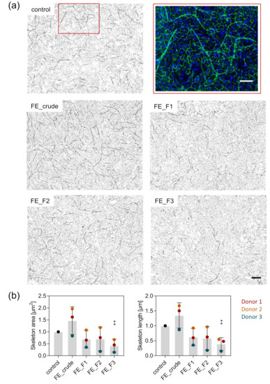 To visualize the influence of the fucoidan extracts on the formation of angiogenic tube-like structures, we co-cultured OEC and MSC and stained for the endothelial cell-specific adherens junction molecule VE-cadherin one week after fucoidan treatment. In the co-culture system, cells are able to interact, giving OEC the possibility to establish first angiogenic structures. Subsequently, we quantified the length and area of the emerged tube-like structures. Treatment with the fucoidan fractions FE_F1, F2 and F3 impaired the formation of these structures. The observed effect was strongest when cells were treated with the fraction FE_F3, richest in fucose and sulfates (Figure 4a). The quantification of structure length and area supports the observations from the microscopy pictures. Structure length and area were decreased by treatment with the fucoidan fractions FE_F1 and F2 to the same extent, while FE_F3 treatment decreased structure length and area significantly.