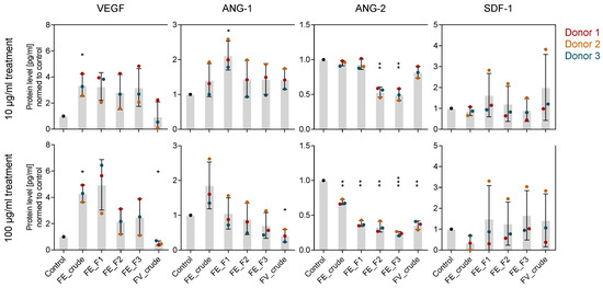 To reveal more details on how fucoidans interfere with the angiogenic process on a molecular level, we determined expression and protein level of the angiogenic mediators VEGF, ANG-1, ANG-2 and SDF-1 in OEC-MSC co-culture after 7 days of treatment. In contrast to the mono-culture system, all the tested marker genes were expressed as in the control cells (Figure S2). While ANG-2 protein levels were decreased similarly to the mono-culture system, VEGF protein levels were slightly increased (Figure 5). Furthermore, ANG-1 protein levels were slightly decreased when cells were treated with 100 µg/mL of FE_F2 and FE_F3. Differences in protein levels due to the extract purity occurred only when cells were treated with a high fucoidan concentration of 100 µg/mL. As observed in the mono-culture, treatment with purer extracts lowered protein levels of VEGF, ANG-1 and ANG-2 in a stronger way (Figure 5 bottom).