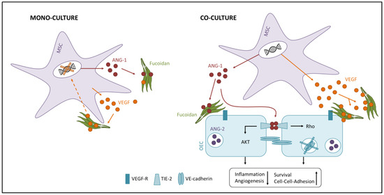 Angiogenesis is a very dynamic and carefully regulated process. To better understand the molecular mechanism underlying the observed anti-angiogenic phenotype caused by fucoidan treatment, we quantified VEGF, SDF-1, ANG-1 and ANG-2 expression and protein level in mono- and co-cultures (Figure 2 and Figure 5).