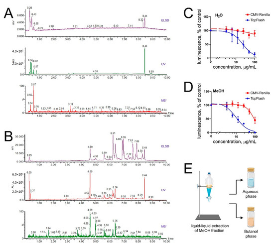Extracts of Ophiura sarsii reveal anti-Wnt and cytotoxic activities. (A,B) Chromatograms of ethanol extracts of O. sarsii after additional solid-phase extraction (SPE) with elution with water (A) and methanol (B). Polar compounds, most probably inorganic salts, are abundant in the water fraction (A), while the methanol fraction (B) appears enriched in secondary metabolites of interest. (C,D) Acute cytotoxicity (CMV-Renilla) and anti-Wnt (TopFlash) biological assays reveal that the methanol fraction (D) is indeed enriched in both activities. (E) Scheme of the liquid–liquid extraction of the methanol fraction, which produced the butanol phase where the biological activities concentrated.