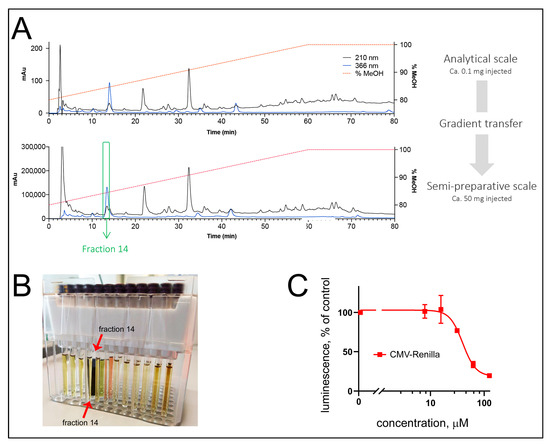 Isolation of the cytotoxic activity from O. sarsii. (A) Gradient transfer from the analytical HPLC-PDA (up) to the semipreparative HPLC-UV (down) of the butanol phase, resulted in the isolation of fraction 14. (B) NMR tubes of the different fractions, showing the strong dark-blue coloration of fraction 14. (C) Fraction 14 mediated the cytotoxic activity of O. sarsii in the acute cytotoxicity (CMV-Renilla) assay.