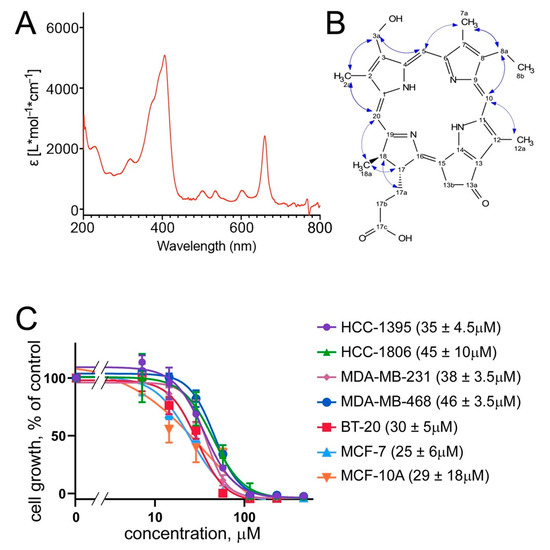 A porphyrin compound, (3S,4S)-14-Ethyl-9-(hydroxymethyl)-4,8,13,18-tetramethyl-20-oxo-3-phorbinepropanoic acid, mediates cytotoxicity of O. sarsii. (A) UV spectrum of the fraction 14 reveals absorbance peaks typical for porphyrins. (B) NMR identified the compound in fraction 14 as (3S,4S)-14-Ethyl-9-(hydroxymethyl)-4,8,13,18-tetramethyl-20-oxo-3-phorbinepropanoic acid (1); ROESY correlations of compound 1 are shown as blue arrows. (C) Cell proliferation (MTT) assay shows a broad cytotoxicity of compound 1 against breast cancer lines. IC50 data are shown to the right of the graph as mean ± SEM values, n = 4.