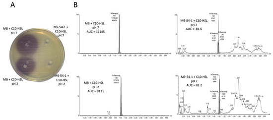To determine whether the QQ activity of strain M9-54-1 is due to an AHL lactonase, an acidification assay was performed using C10-HSL, an AHL that was completely degraded by this strain. The concentration of AHLs was not restored in the acidified and filtered supernatant when they were tested by agar well diffusion assay (Figure 2A). To confirm this result, the AHL concentration was also analyzed by HPLC-MS (Figure 2B). The QQ activity of strain M9-54-1 was observed to be 100%, with no recovery in AHL concentration being detected following incubation under acidic conditions. These findings suggested that the mechanism by which autoinducers are degraded was not caused by an AHL lactonase.