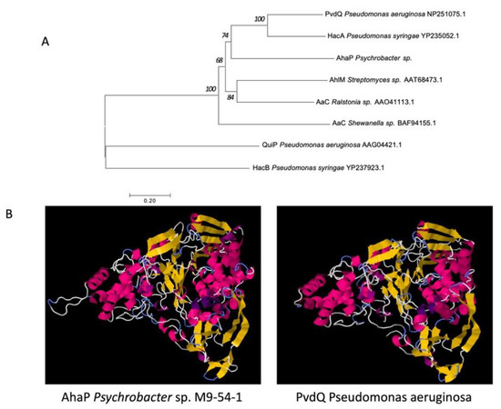 (A). Phylogenetic analysis of the acylase AhaP from Pyschrobacter sp. M9-54-1 and other known acylases using the neighbor-joining method with 1000 bootstrap replications. (B). Comparison of the predicted structures of the acylases AhaP from Psychrobacter sp. M9-54-1 and PvdQ from Pseudomonas aeruginosa PAO1 using the Phyre2 program.