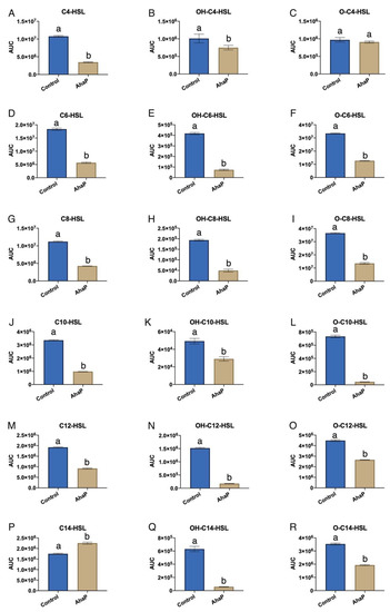 Quorum quenching activity of the purified enzyme AhaP against synthetic AHLs (C4-HSL (A), OH-C4-HSL (B), O-C4-HSL (C), C6-HSL (D), OH-C6-HSL (E), O-C6-HSL (F), C8-HSL (G), OH-C8-HSL (H), O-C8-HSL (I), C10-HSL (J), OH-C10-HSL (K), O-C10-HSL (L), C12-HSL (M), OH-C12-HSL (N), O-C12-HSL (O), C14-HSL (P), OH-C14-HSL (Q), O-C14-HSL (R). Autoinducer activity was detected with the biosensor strains E. coli (pSB536) for C4-HSL and its derivatives; E. coli (pSB401) for C6-, C8- and C10-HSL and their derivatives; and E. coli (pSB1142) for C12- and C14-HSL and their derivatives. Values are expressed as the area under the curve (AUC) of relative light units/OD600. Different letters above the bars indicate that the values are significantly different (p < 0.05).