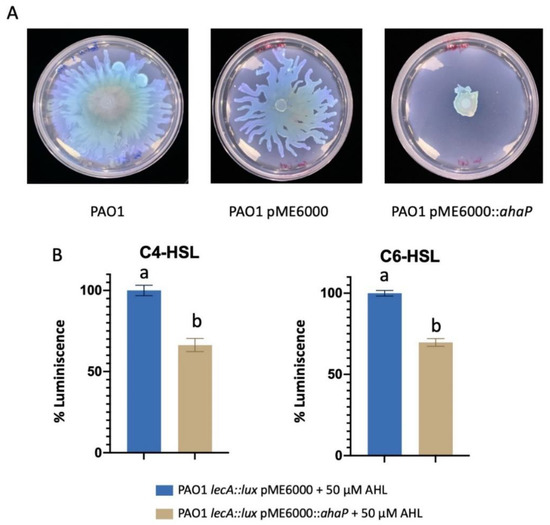 Evaluation of ahaP expression in P. aeruginosa PAO1. (A). Swarming motility assay of PAO1 wild type and strains containing the pME6000::ahaP construct and empty plasmid pME6000. (B). Detection of luminescence production in the biosensor strains PAO1 lecA::lux and PAO1 lecA::lux containing the pME6000::ahaP construct and empty plasmid pME6000 in the presence of C4- and C6-HSL. Different letters above the bars indicate that the values are significantly different (p < 0.05).