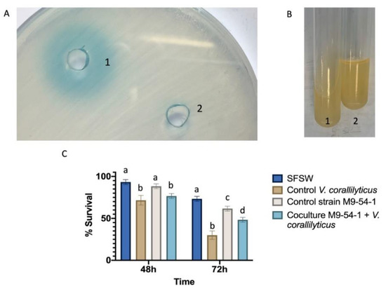 The virulence of V. coralliilyticus VibC-Oc-193 in the absence and presence of strain M9-54-1 was tested in vivo in Artemia salina (brine shrimp) nauplii according to a protocol described elsewhere [10,24]. Briefly, the hatching cysts of A. salina (JBL Artemio Pur, JBL GmbH & Co. KG, Neuhofen, Germany) were obtained according to the manufacturer’s instructions using sterile-filtered and autoclaved seawater (SFSW) (salinity 36 g L−1, 20 °C, pH 7.3), and groups of 20 nauplii were transferred to petri dishes containing 20 mL of SFSW. Then, co-cultures were made with 5 mL of 24-h culture of M9-54-1 to which 50 µL of a 24 h culture of V. coralliilyticus were added. As controls, monocultures of strain M9-54-1, V. coralliilyticus and the same volume of SFSW were used. For each condition, the bacterial cells were washed with SFSW and added to the shrimp larvae in a final concentration of 106 CFU mL−1, with cell number determined by the plate counting method, and were then incubated at 25 °C for 3 days. Each condition was done in triplicate. The survival of the shrimps, detected by loss of motility, was scored daily after the addition of bacteria. All results were analyzed using the ANOVA test (p < 0.05) followed by Tukey´s t-test using R software (3.6.2) (The R Foundation, Vienna, Austria).