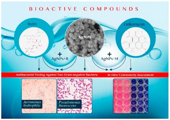Therefore, new bioactive compounds for safe and effective antimicrobial therapy should be considered. Biosynthesized AgNPs are supposed to have a better safety level [16]. Additionally, plant-derived flavonoids, a large group of naturally occurring phenylchromones found in fruits and vegetables, have diverse biological activities [17]. Rutin (3, 3′, 4′, 5, 7 pentahydroxyflavone-3-hamnoglucoside) is a flavonoid glycosidic compound found mainly in lemons, oranges, berries, limes, and grapes. Rutin exhibits a variety of biological and pharmacological activities, including antioxidant, antidiabetic, immunomodulatory, anti-inflammatory, and neuroprotective effects [18,19]. Heliomycin is a secondary metabolite released from marine actinomyctes. It is an aromatic polyketide in structure [20] and exhibits antibacterial, antiviral, and anticancer activities [21,22]. Heliomycin inhibits RNA polymerase [23] that leads to apoptosis [22] and inhibition of RNA and protein synthesis. Additionally, it acts as a histone deacetylase inhibitor [24]. Therefore, we postulated that combined treatment of natural products and biosynthesized AgNPs might offer a balanced solution between efficacy and safety. In the present study, we aimed to develop novel, safe, and effective therapeutic compounds against the two bacterial strains affecting the aquaculture industry. To achieve this goal, we tested biosynthesized AgNPs, rutin, and heliomycin, and combinations of AgNPs and rutin (AgNPs + R) and AgNPs and heliomycin (AgNPs + H) against A. hydrophila and P. fluorescens (Figure 1). A cytotoxicity study was performed to test the compounds on epithelioma papulosum cyprinid (EPC) fish cell lines to evaluate their safety. We believe that it is the first study on the synergistic inhibitory effects of biosynthesized AgNPs, phytogenic compounds, and secondary metabolites on the pathogens affecting aquaculture, namely A. hydrophila and P. fluorescens. Both Gram-negative strains were selected as they are potentially pathogenic for fish and humans, more cross resistant to popular antibiotics, and more abundant in aquaculture fish and water [25].