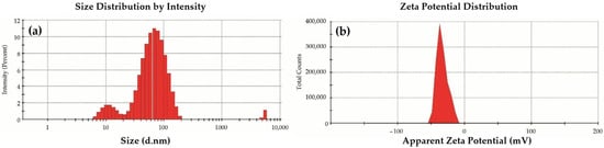 Characterization of biosynthesized AgNPs. (a) Particle size distribution with intensity peaks at 12.1 nm and 73.7 nm, average size of 56.1 nm, and polydispersity index (PDI) of 0.36, which indicates good homogeneity of the AgNPs. (b) Zeta potential distribution with maximum charge of −33.8. All data are expressed as means ± SD (n = 3).