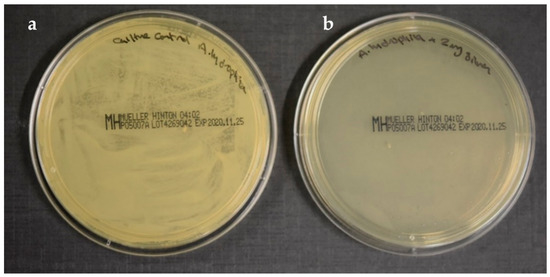 The bactericidal effect of silver nanoparticles against A. hydrophila. (a) Bacterial culture of A. hydrophila. (b) Treated plate with AgNPs (2 µg/mL).