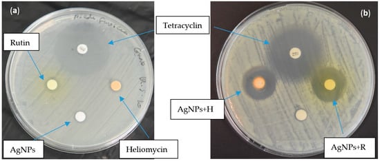 Disc diffusion assay results for the antibacterial effect of tested bioactive compounds against P. fluorescens. (a) Zone of inhibition for individual compounds: rutin R (512 µg/mL), heliomycin R (512 µg/mL), AgNPs (2 µg/mL), and tetracycline (10 µg) as positive control. (b) Widening of inhibition zone (arrow) for the combination of AgNPs + R and AgNPs + H at the same concentrations.