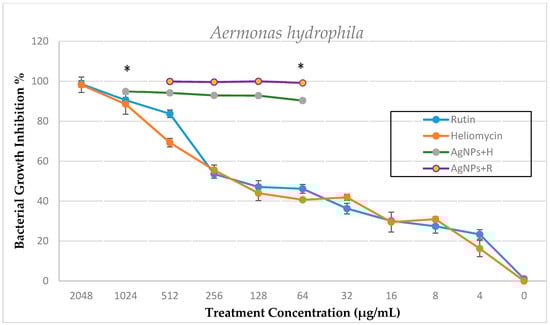 Percent inhibition of A. hydrophila growth when tested against a serial dilution of rutin and heliomycin (2048 µg/mL to 0 µg/mL) and sub-MIC combinations of AgNPs + rutin (R) and AgNPs+ heliomycin (H). All data are expressed as means ± SD (n = 3). Error bars represent the standard deviation from average values. * Statistical significance from control (p < 0.05).