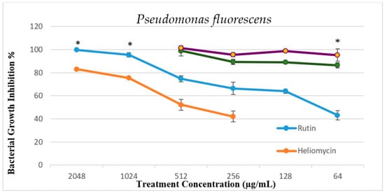 Percent inhibition of P. fluorescens growth when tested against serial dilutions of rutin and heliomycin (2048 µg/mL to 64 µg/mL) and sub-MIC combinations of AgNPs + rutin (R) and AgNPs + heliomycin (H). All data are expressed as means ± SD (n = 3). Error bars represent the standard deviation from average values. * Statistical significance from control (p < 0.05).