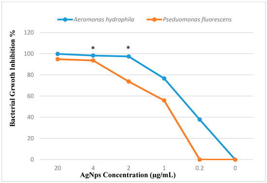 Percent inhibition of A. hydrophila and P. fluorescens at tested silver nanoparticles AgNPs doses (0–20 µg/mL). All data are expressed as means ± SD (n = 3). * Statistical significance from control (p < 0.05).
