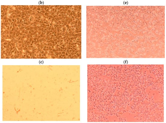 Morphological changes of epithelioma papulosum cyprinid (EPC) fish cell lines exposed to MIC of tested treatments for 24 h. No morphological changes were observed in control cells (a) and in rutin-treated cells at 1024 µg/mL, (b) while cell detachment, vacuolations, and cell swelling were observed in heliomycin-treated cells at 1024 µg/mL (c) and in combination with AgNPs (AgNPs 1 µg/mL + H 64 µg/mL). (f) A mild cell shrinkage was observed in AgNPs-treated cells with MIC (2 µg/mL) (d) and in combination with rutin-treated cells (AgNPs 1 µg/mL) + R 64 µg/mL (e).