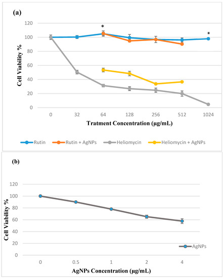 Assessment of in vitro cytotoxicity of tested bioactive compounds on the EPC cell line after 24 h exposure by Alamar blue assay. (a) Rutin and heliomycin two-fold serial dilutions sub-MIC combinations with AgNPs (1 µg/mL). (b) Cell viability against AgNPs serial dilution. * Statistical significance from control (p < 0.05).