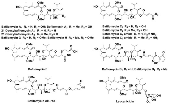 - Werner, G.; Hagenmaier, H.; Dpautz, H.; Baumgartner, A.; Zähner, H. Metabolic products of microorganisms. 224. Bafilomycins, a new group of macrolide antibiotics. Production, isolation, chemical structure and biological activity. J. Antibiot. 1984, 37, 110–117. [Google Scholar] [CrossRef]