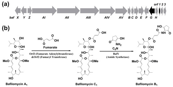 To engineer a bafilomycin A1 high-producer, knowledge on its biosynthetic mechanisms is required. To date, at least six bafilomycin biosynthetic gene clusters from Streptomyces and Kitasatospora species have been reported by this and other laboratories [8,10,20,21,22,23]. The modular and domain organization in five type I polyketide synthase (PKS) genes (exemplified by bafAI–bafAV, Figure 2a) collinearly matches the structure of bafilomycin A1. The five open reading frames bafB–F are responsible for biosynthesis of the methoxymalonate extender unit based on bioinformatics analysis. Recently, we completely elucidated the post-PKS tailoring steps (Figure 2b) of the bafilomycin biosynthetic pathway in Streptomyces lohii ATCC BAA-1276. Specifically, the adenylyltransferase Orf3 activates fumarate to fumaryl-AMP, whose fumaryl moiety is then transferred to C21-hydoxyl group of bafilomycin A1 by the fumaryl transferase Orf2, giving rise to bafilomycin C1. Next, the ATP-dependent amino synthetase BafY catalyzes the C–N bond formation between bafilomycin C1 and 2-amino-3-hydroxycyclopent-2-enone (C5N) to form bafilomycin B1. The C5N unit is assembled by the acyl-CoA ligase BafX and the bifunctional enzyme BafZ [9,20].