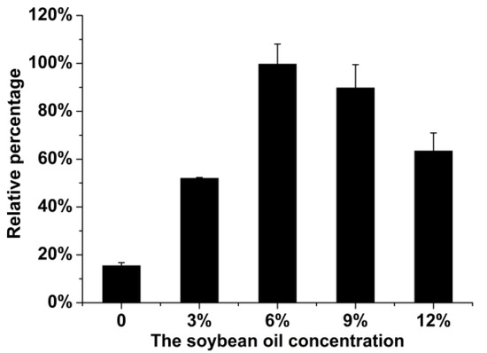 The relative percentage of bafilomycin production by wild-type S. lohii when supplied with different concentrations (w/v) of soybean oil in fermentation media. Note: The average bafilomycin production in the fermentation medium with 6% soybean oil is assigned as 100%.