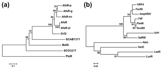 The neighbor-joining trees of (a) BafG with other identified Streptomyces AfsR homologues and (b) Orf1 with other identified LuxR family proteins. AfsR family proteins: AfsR (993 aa, GenBank accession number: BAA14186.1) and SCO3217 (638 aa, NP_627431.1) from Streptomyces coelicolor A3(2), AfsR-sl from Streptomyces lividans TK 24 (993 aa, EFD67634.1), AfsR-sv from Streptomyces venezuelae ATCC 15439 (1056 aa, ABR08660.1), SCAB1371 from Streptomyces scabies 87.22 (641 aa, CBG67361.1), AfsR-p from Streptomyces peucetius ATCC 27952 (982 aa, CAH10136.1), PteR from Streptomyces avermitilis MA-4680 (1096 aa, NP_821585.1), AfsR-g from Streptomyces griseus (974 aa, BAA83790.1), and Orf2 from Streptomyces acidiscabies ATCC 49003 (990 aa, BAO31545.1); LuxR family proteins: LuxR from Vibrio fischeri ATCC 7744 (250 aa, CAA68561.1), SalRIII from Streptomyces albus (231 aa, ABG02265.1), ORF4 from Streptomyces noursei ATCC 11455 (210 aa, AAF71781.1), FscRI from Streptomyces sp. FR-008 (222 aa, AAQ82551.1), PimM from Streptomyces natalensis (192 aa, CAM35468.1), ScnRII from Streptomyces chattanoogensis (192 aa, ADX66474.1), AmphRIV from Streptomyces nodosus (243 aa, WP_079161981.1), FilF from Streptomyces filipinensis (192 aa, AKX77828.1), LasR from Pseudomonas aeruginosa (239 aa, BAA06489.1), GerE from Bacillus subtilis (74 aa, CAA11701.1), and NarL from Escherichia coli K-12 (216 aa, AKK17394.1). The bars show the distance representing 0.1 (a) and 0.05 (b) substitutions per amino acid position and the bootstrap percentages under 50% from 1000 replicates are hidden.
