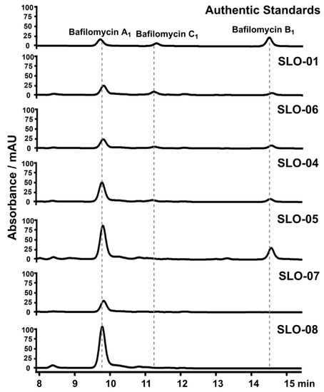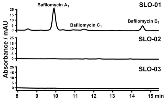 HPLC analysis (254 nm) of the bafilomycin production by wild-type and mutant S. lohii strains.