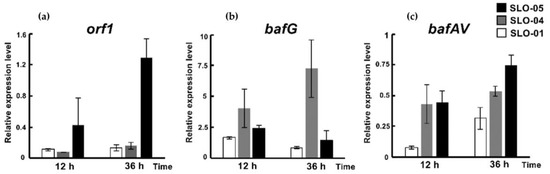 The relative transcriptional levels of (a) orf1, (b) bafG, and (c) bafAV in wild-type and the orf1/bafG overexpressed S. lohii strains at 12 h and 36 h.