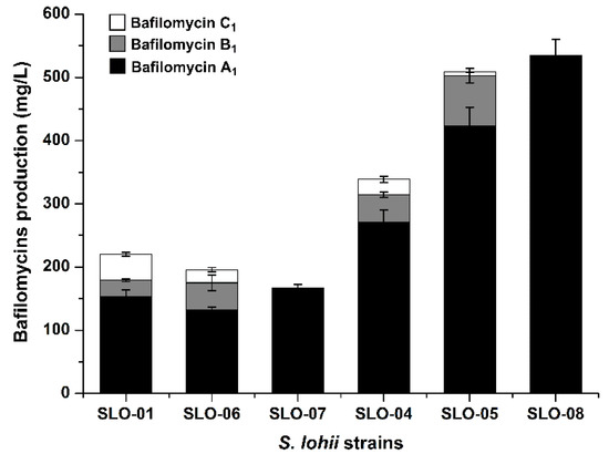 The bafilomycin production (mg/L) by wild-type and mutant S. lohii strains.