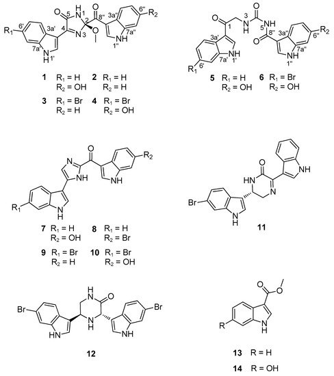 In addition to new compounds 1–6, the crude extract of Spongosorites sp. contained several indole-bearing congeners. Extensive chromatographic separation of these followed by combined spectroscopic analyses led to the identification of eight previously reported compounds. Categorized as four topsentins, two hamacanthins, and two monoindoles, these were topsentin (7) [37], isobromodeoxytopsentin (8) [14], bromodeoxytopsentin (9) [14], bromotopsentin (10) [14], (R)-6′′-debromohamacanthin A (11) [38], (3S, 5R)-6-dibromo-trans-3,4-dihydrohamacanthin B (12) [39], 3-carbomethoxyindole (13) [40], and 6-hydroxy-3-carbomethoxyindole (14) [40]. The spectroscopic data of these were in good accordance with those in the literature.
