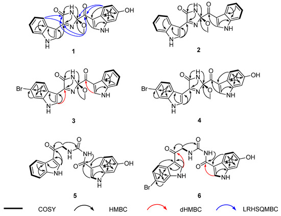 Key correlations of 1H-1H COSY (bold line), HMBC (arrow), dHMBC (red arrow), and LRHSQMBC (blue arrow) experiments for compounds 1–6.