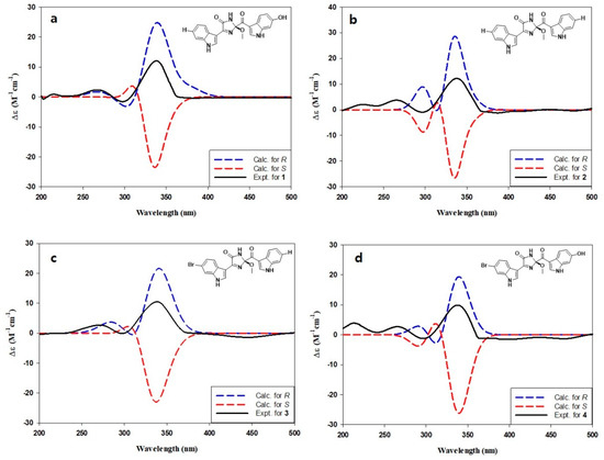 (a–d) Comparison of measured and calculated ECD profiles of compounds 1–4, respectively.