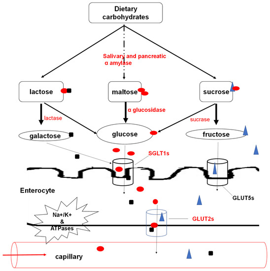 SGLT1 is a high-affinity Na-glucose transporter whose binding is directly influenced by a 2:1 stoichiometric ratio for Na+ and D-glucose, respectively [28]. The presence of Na+ allows a conformational change in the SGLT1, enabling the D-glucose to bind with higher affinity. Subsequently, the Na+ dissociates from its binding site causing a decreased transporter affinity for D-glucose, which is released into the cytoplasm. The SGLT1 completes its cycle in a slow transition to reorient its binding site to the extracellular process [29]. The active movement conferred by Na+, K+ and ATPases, bringing in D-glucose through SGLT1, creates a steep glucose concentration gradient across the luminal membrane [30]. Afterwards, glucose leaves the cell’s basolateral side by facilitated diffusion using glucose transporters (GLUT2s) to the extracellular medium near blood capillaries [31]. The absorbed glucose within the capillaries is then transported via mesenteric circulation to target cells.