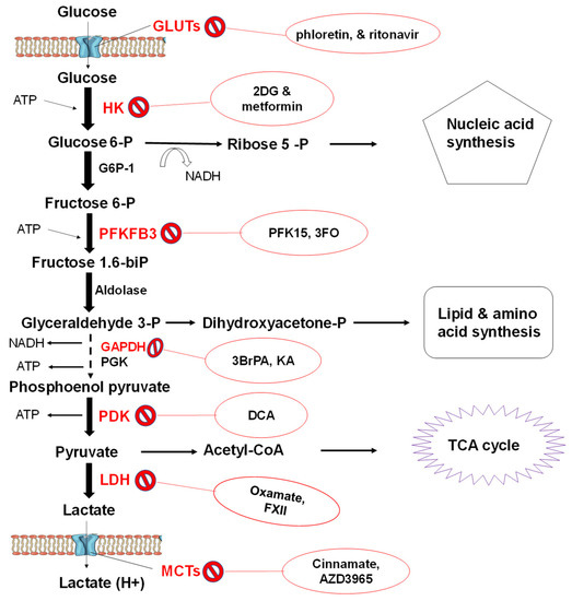 The glycolytic flux process. A summary of the glycolysis pathway with its metabolic intermediates that can be used for various processes by cells. The known glycolytic enzyme inhibitors are presented in red circles and their target enzymes in red. Glucose transporters (GLUTs) and lactate monocarboxylate transporters (MCTs) are shown as transmembrane proteins. Moreover, the enzymes and transporters illustrated may be plausible targets for fucoidan. Adapted from [60].