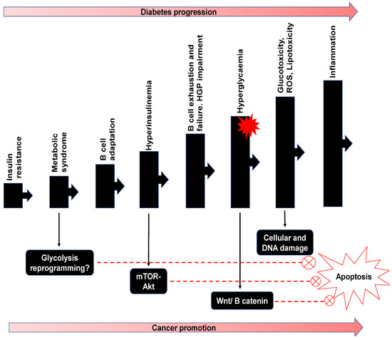 Shared factors in the progression of diabetes and cancer promotion. Insulin resistance, glycolysis reprogramming and β-cell failure, all increase hyperglycaemia. These also alter pathways protecting tumour cells from apoptosis and encourages tumour proliferation. Fucoidan may be useful in regulating one or more pathways which may directly affect glucose metabolism. Adapted from [11].