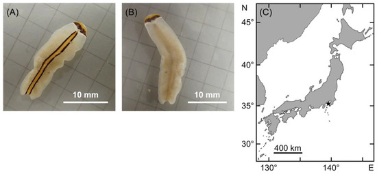 Two flatworm specimens were collected from the coastal area of Hayama, Kanagawa, Japan under stones in the intertidal zone, and a rocky bottom at a depth of approximately 10 m. These were identified as Pr. trilineatum based on the description of external morphology [28,29]; broadly elongated body, rounded anteriorly and tapered posteriorly; longitudinal orange-yellow stripe bordered by black band running medially (Figure 1).
