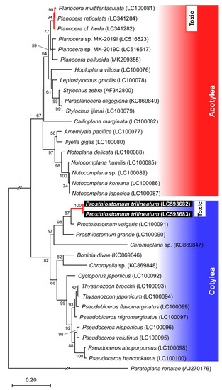 Phylogenetic position of Prosthiostomum trilineatum among polyclad species inferred from the 28S rRNA gene sequence. The phylogenetic tree was constructed by maximum likelihood analysis. Numbers at branches denote the bootstrap percentages from 1000 replicates. The accession numbers for the sequences are shown in parentheses. The accession numbers LC593682 and LC593683 refer to those deposited in the DDBJ/EMBL/GenBank databases in this study. The sequence from Paratoplana renatae was used as the outgroup. Only bootstrap values exceeding 50% are presented. The scale refers to nucleotide substitutions per site.