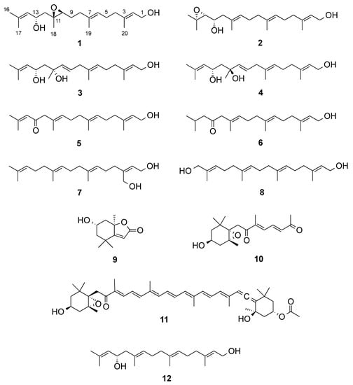 In addition, seven known compounds (5–11) were isolated. Based on their 1D/2D NMR, HR-ESIMS, and [α]D data, they were identified as eleganolone (5) [6],6 its dehidyro-derivative (6) [6,21], 20-hydroxygeranylgeraniol (7) [22,23], 16-hydroxygeranylgeraniol (8) [21,24], loliolide (9) [25], a truncated fucoxanthin analogue (10) [26], and fucoxanthin (11) [27].
