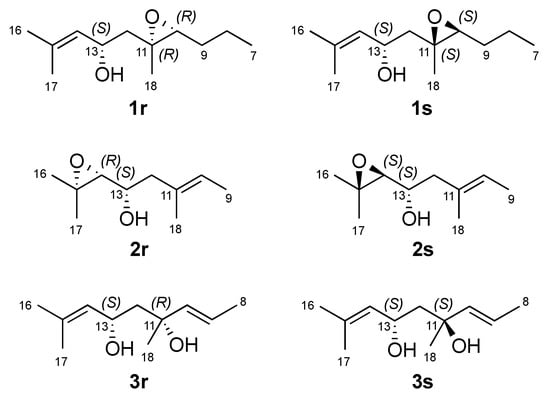 Absolute configuration of compound 1 was determined using DFT prediction of optical rotation (OR) [17,18,19], using the same set of optimized conformers of model compound 1s (Figure 2) that were used for NMR chemical shift prediction. In doing so, we made the reasonable assumption that the contribution to chiroptical properties, including molar rotation, of a remote non-chiral side chain is negligible [11]. Specific rotations of each conformer were calculated at the B3LYP/TZVP/SMD level, taking care to convert molar rotations into specific rotations using the molecular weight of compound 1 and not that of the model compound 1s. The calculated Boltzmann-averaged specific rotation was +13.3, in good agreement with the experimental value +17.0. Therefore, compound 1 was identified as 2E,6E,10S,11S,13S,14E)-3,7,11,15-tetramethylhexadeca-2,6,14-triene-10,11-epoxy-1,13-diol, which we named as 10S,11S-epoxyeleganediol.