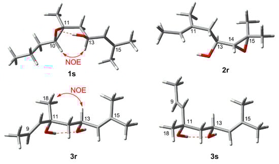 The E geometry of the double bonds ∆2,3, ∆6,7 and ∆14,15 was deduced on the basis of NOE couplings observed between H-2/H2-4, H-6/H2-8 and, H-14/H2-12 respectively. The olefinic terminal methyl groups H3-16 and H3-17 were identified as pro-E and as pro-Z, respectively, due to further NOE correlations between H-14/H3-16 and H-13/H3-17. A trans stereochemistry for the epoxy ring was suggested by the observed NOESY correlation between H-10 and H2-12. Assignment of relative configuration of C-13 and C-10/C-11 was based on DFT prediction of 1H and 13C chemical shifts [13]. Due to the high conformational flexibility of compound 1, calculations were performed using the simplified model compounds 1r (10R,11R,13S) and 1s (10S,11S,13S), comprising atoms C-7 to C-18 (Figure 2). A systematic conformational search over the six rotable bonds of 1r/1s produced 292 and 251 sterically allowed unique conformers for 1r and 1s, respectively. The geometry of all conformers was optimized quantum mechanically using Gaussian 16 [14] with the B3LYP functional, the 6-31G(d,p) basis set, and the SMD continuous solvent model. Conformers with a Boltzmann weight less than 1% were removed, resulting in 15 conformers for 1r and 16 conformers for 1s, which were used for subsequent calculations. 1H and 13C chemical shifts were calculated at the mPW1PW91/6-311+G(2d,p)/SMD level, using the scaling factors determined by the Tantillo group [15], and average chemical shifts were calculated using Boltzmann distribution. Only atoms at positions 10 to 18 of model compounds 1r/1s were considered in the comparison with experimental chemical shift, because they were at least three bonds away from the first point of difference with 1. The results showed that NMR chemical shifts predicted for model compound 1s (RMSD of 1.59 ppm for 13C and 0.099 ppm for 1H) matched experimental chemical shifts much better than those predicted for 1r (RMSD of 1.96 ppm for 13C and 0.206 ppm for 1H). DP4+ analysis [16], providing 100% probability of 1s as the correct stereoisomer, confirmed this assignment. This computational work was supported by the NOESY data. A hydrogen bond between the OH group at C-13 and the oxirane O atom is observed in all the six lowest energy conformations of the 1s, accounting for 74% of the population. These conformers also show a close proximity (2.13 Å) between H-10 and H-13 (Figure 3), which is in accordance with the intense NOESY correlation peak between these two protons.