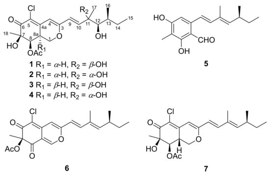 Meticulous chromatography of the extracts of Penicillium sclerotiorum resulted in the isolation of two new (1 and 2) and five known (3–7) azaphilones. Those isolated compounds were identified as 8a-epi-hypocrellone A (1), 8a-epi-eupenicilazaphilone C (2), together with five known azaphilones, hypocrellone A (3) [], eupenicilazaphilone C (4) [], ((1E,3E)-3,5-dimethylhepta-1,3-dien-1-yl)-2,4-dihydroxy-3-methylbenzaldehyde (5) [], sclerotiorin (6) [], and isochromophilone IV (7) [] (Figure 1).
