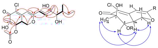 According to the HRESIMS data (m/z 451.1493, [M+Na]+), a molecular formula of C21H29ClO7 was assigned to 1. The UV absorption maxima at λmax 351 and 250 nm, and the IR absorption bands at 3472 (OH), 1708, and 1677 (carbonyls) cm−1, implied that 1 possesses an azaphilone skeleton. The 1H NMR spectrum of 1 (Table 1) exhibited a trans C=C double bond at δ 6.30 (d, J = 15.5; H-9) and δ 6.55 (d, J = 15.5; H-10), an olefinic singlet at δ 6.10 (H-4), two oxymethines at δ 5.52 (d, J = 2.5; H-8) and δ 3.49 (brs, H-12), an oxygen-bearing methylene at δ 4.47 (dd, J = 10.8, 4.8; H-1α) and δ 3.81 (m, H-1β), two methines at δ 3.23 (m; H-8a) and δ 1.70 (m, H-13), an acetate methyl at δ 2.02 (H-20), and four methyls at δ 0.92 (t, J = 7.0; H-15), δ 0.97 (d, J = 6.8; H-16), δ 1.32 (s; H-17), and δ 1.45 (s; H-18). Inspection of the 13C and DEPT data of 1 (Table 1) demonstrated twenty-one carbons of an azaphilone, including one conjugated carbonyl (δ 192.5), one acetyl group (δ 170.7 and 20.7), three olefinic quaternary carbons (δ 117.4, 144.3, and 161.0), three olefinic methines (δ 102.6, 112.6, and 144.5), two oxymethines (δ 74.4 and 78.5), two oxygen-bearing quaternary carbons (δ 76.0 and 76.3), one oxymethylene (δ 67.5), two methines (δ 35.5 and 36.9), one aliphatic methylene (δ 28.8), and four methyls (δ 12.0, 13.5, 23.7, and 24.6). The 6/6-fused bicyclic ring moiety of azaphilone was established by COSY correlation of H-1/H-8a/H-8 and HMBC correlations of H-1/C-3 (δ 161.0), C-4a (δ 144.3), H-4/C-3, C-5 (δ 117.4), and H-8/C-4a, C-6 (δ 192.5), C-7 (δ 76.3) (Figure 2). The HMBC correlations from Me-18 to C-6, C-7, C-8 indicated a methyl and a hydroxy group attaching at C-7. In addition, the HMBC correlations from both H-8 and H-20 to C-19 revealed an acetyl group attaching at C-8. The COSY spin systems of H-9/H-10 and H-12/H-13/Me-16, together with the HMBC correlations from H-15 to C-13 (δ 67.5) and C-14 (δ 67.5), from H-17 to C-10 (δ 141.6), C-11 (δ 76.2), C-12 (δ 79.2), and from H-9 to C-3 were used to construct the side chain of azaphilone with two hydroxy groups located at C-11 and C-12. Finally, a chloride atom was assigned at C-5 by virtue of the MS analysis (m/z 451 and 453 showed a ratio of 3:1) and the characteristic carbon chemical shift []. Therefore, the planar structure of compound 1 was established.