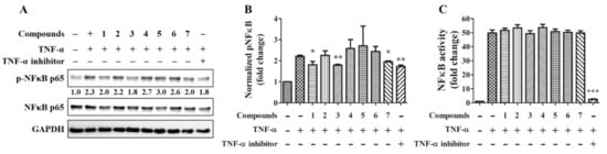 Effects of compounds on NFκB signaling and activity. 20 ng/mL TNF-α together with or without 20 μM of the individual compound were treated to TPH cells for 30 min (A,B; n = 3) or to the NFκB reporter cells for 24 h (C; n = 6). 10 μM IκB/IKK inhibitor BAY 11-7082 serve as a positive control. * for p < 0.05, ** for p < 0.01, and *** for p < 0.001.