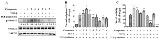 Cytokine TGF-β is widely implicated in the pathogenesis of fibrosis in tissue organs. It has been proposed that effectively target TGF-β driving cell differentiation and synthesis or stabilization of extracellular matrix (ECM) can suppress fibrotic disease progression []. In order to test compounds with a potential effect on preventing tissue fibrosis, the TGF-β-induced Smad2/3 phosphorylation was tested by immunoblotting (Figure 6A). The quantitative result showed that compound transcriptional activity was tested. The result showed compounds 2 and 3 significantly increase and decrease Smad2/3 phosphorylation respectively (Figure 6B); the TGFβRI inhibitor showing a trend toward a decrease in Smad2/3 phosphorylation but approaching borderline statistical significance (p = 0.08). TGF-β stimulates SMAD transcriptional increased by compounds 1, 2, and 4 and decreased by compound 6 and the TGFβRI inhibitor (Figure 6C).