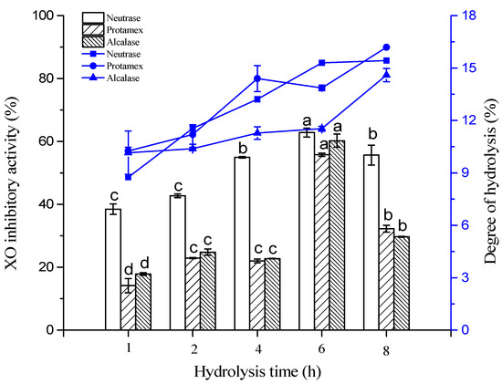 XO inhibitory activity and the degree of hydrolysis of the RSHs obtained by hydrolysis with different proteases. Different letter of ‘a–c’ on the top of same pattern column represents significant difference (p < 0.05) in the XO inhibitory activity of RSHs obtained by same protease at different hydrolysis time. For example, the first column represents the XO inhibitory activity of RSHs obtained by neutrase from hydrolysis among 1 to 8 h. There is a significant difference between 6 h (labelled with ‘a’) to both 4 and 8 h (both labelled with ‘b’ which means no significant difference between 4 and 8 h) or to both 1 and 2 h (both labelled with ‘c’). Same rule also used for ‘a–d’ for the RSHs obtained by protamex or by alcalase (middle or last column of different hydrolysis time).