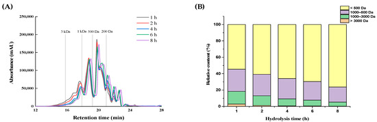 Molecular weight distribution (A) of RSHs obtained with neutrase and the relative content (B) of fractions with different molecular weight in RSHs.