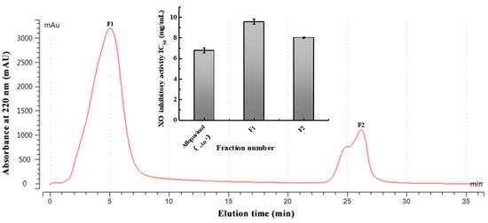 Immobilized metal affinity chromatography (IMAC) was widely used in the separation and purification of metal chelating peptides due to its specific metal biosorption capacity [25]. It has been reported that IMAC can be used as an effective approach to separate low MW peptides because it can reduce the adsorption interference of large proteins [26]. RSHs with the highest XO inhibitory activity (6 h hydrolysates obtained by neutrase) were further purified via IMAC. As shown in Figure 3, two fractions (F1 and F2) were separated from the RSHs. The fraction F2 exhibited higher XO inhibitory activity (IC50 = 8.03 ± 0.05 mg/mL) than that of the fraction F1 (IC50 = 9.57 ± 0.23 mg/mL). The amino acid sequences of the XO inhibitory peptides in the fraction F2 were further determined by nano-HPLC-MS/MS.