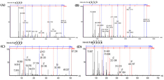 Identification of four XO inhibitory peptides in F2 by nano-HPLC-MS/MS, and the MS/MS spectra of KGFP (A), FPSV (B), FPFP (C) and WPDGR (D). The y1–4 and b1–3 are the y-type and b-type fragment ions in the MS/MS spectra.