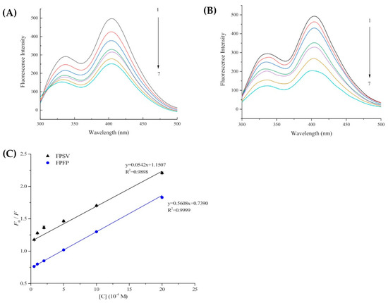 Fluorescence spectra of XO in the presence of FPSV (A) and FPFP (B) at different peptide concentrations (0, 0.5, 1.0, 2.0, 5.0, 10.0 and 20.0 × 10−4 M for curves 1→7, respectively) and the Stern-Volmer plots for the fluorescence quenching of XO by FPSV and FPFP (C).