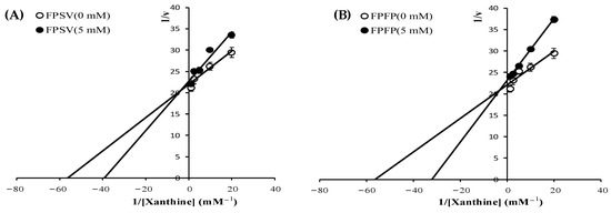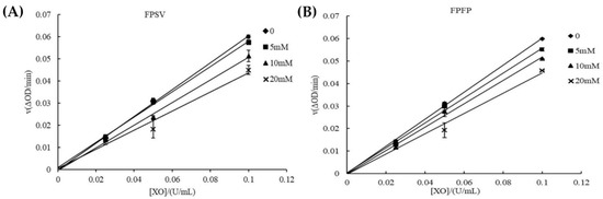Lineweaver-Burk plots for XO inhibition activity with FPSV (A) and FPFP (B).