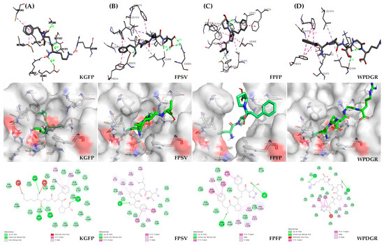 Molecular docking results of KGFP (A), FPSV (B), FPFP (C) and WPDGR (D).